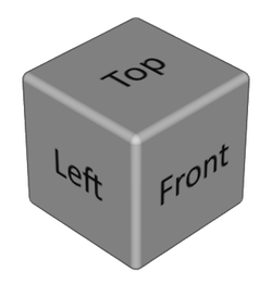 The viewing cube is an interactive shape that indicates the current orientation of a camera (like a "compass" or "gnomon") and also responds to user actions by re-orienting the associated camera to one of the predefined orientations. These orientations are defined so that the camera will be in front of a selected part of the bounding cube of the scene.