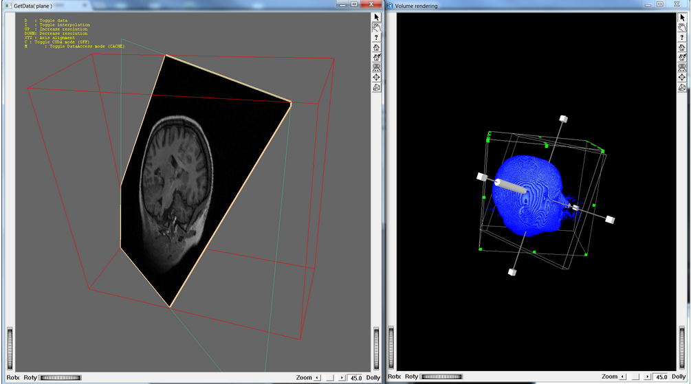 This program displays a plane (in the second viewer) build with data extracted from the given volume (first viewer). To update the second viewer, move the dragger in the main viewer, the plane will be automatically generated in the second viewer. Specifically, a SoTexture2 using the data extracted from the volume is applied to a plane. Changing data access mode (Direct, Direct and prefecth, Cache) will change the amount of memory allowed to LDM. As a result, the main volume will show a different resolution. This program demonstrates that even with low memory settings, data access can reach full resolution in Direct and Direct and prefetch mode.