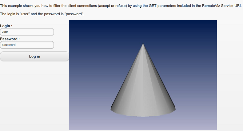This example shows you how to filter the client connections (accept or refuse) by using the GET parameters included in the RemoteViz Service URI. The login is "user" and the password is "password".