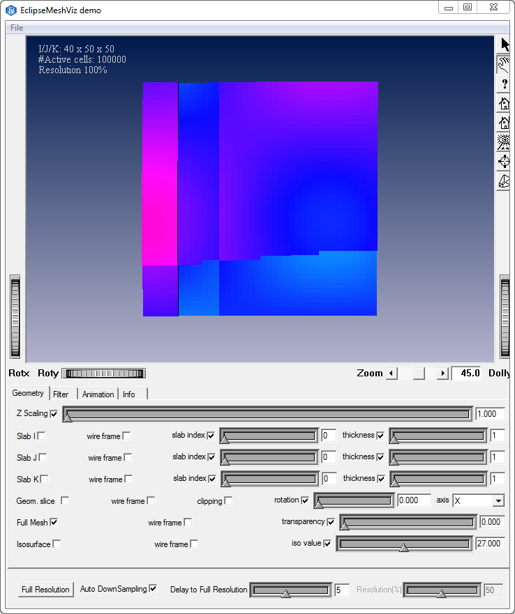 This example shows how to implement an Eclipse mesh using the MiVolumeMeshHexahedronIjk interface and visualize mesh representations including a skin, slabs, a plane slice and an isosurface.