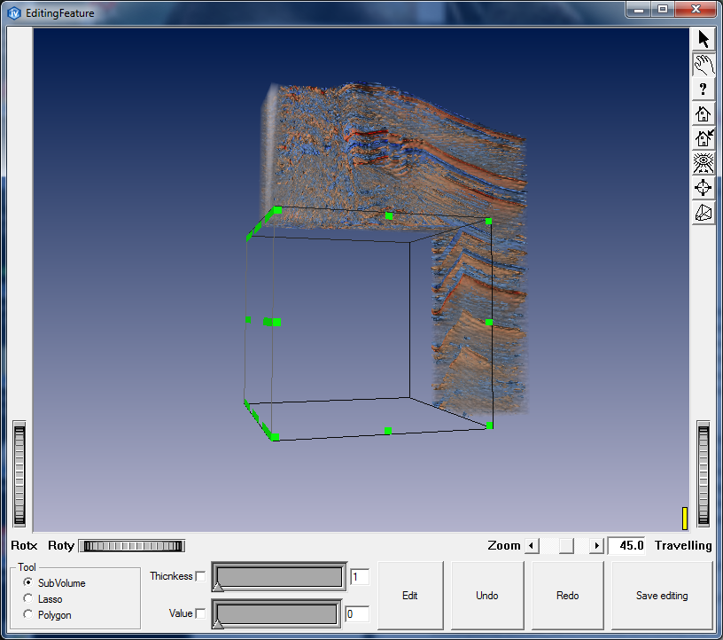 This demo show the whole workflow of editing. Select editing tools (SubVolume, Lasso or Polygon), edit volume and save result.
