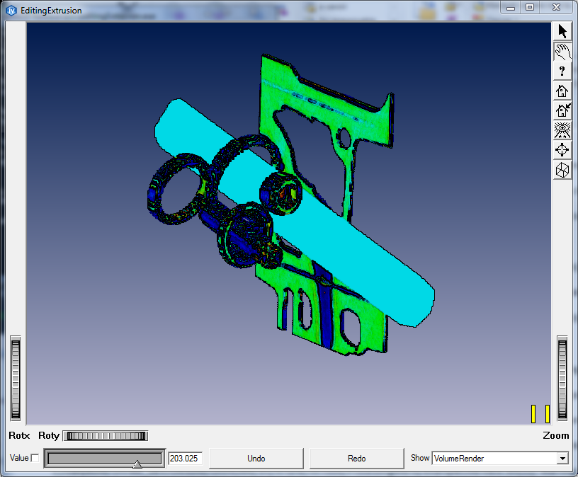 This demo use SoLassoScreenDrawer and SbExtrusionGenerator to generate extruded shapes. These extruded shape are then written to dataSet using current slider value. Contrary to CSGClippingGroup demo that just clip dataSet during rendering, dataset is modified by editing. Use the selection mode (arrow) and draw a lasso on screen. Release mouse to finalize the lasso.