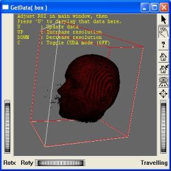 This program displays, in the second viewer, a volume built with data extracted from volume shown in first viewer. To update the second viewer, enter picking mode and press U. The volume taken in account to generate the box is defined by the ROI in the main viewer. Changing data access mode (Direct, Direct and prefecth, Cache) will change the amount of memory allowed to LDM. As a result, the main volume will show different resolution. This has been done to show that, even with low memory settings, data access can reach full resoution in Direct and Direct and prefetch mode.