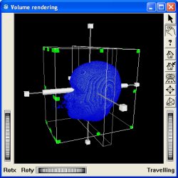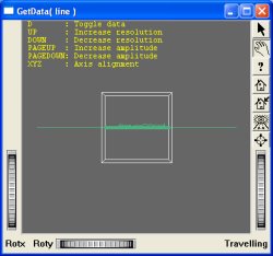 This program displays data extracted along a line (second viewer) from a given volume, which is rendered in the first viewer. To update the second viewer, move the dragger's plane in the main viewer. Line is automatically updated in the second viewer. Changing data access mode (Direct, Direct and prefecth, Cache) will change the amount of memory allowed to LDM. As a result, the main volume will show different resolution. This has been done to show that, even with low memory settings, data access can reach full resoution in Direct and Direct and prefetch mode.