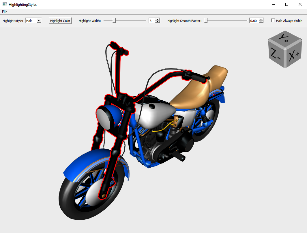 Demonstrates how to use the SoHighlightRenderAction actions to highlight objects. In this example the Viewing Cube is customized with textures available in the folder $OIVHOME/examples/data/Inventor/ViewingCube/Faces/xyz.