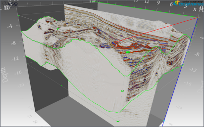 The uniform grid clipping node provides both clipAbove and clipBelow boolean fields. By default only clipAbove is true. Using a pair of grid clipping nodes, one with clipAbove and one with clipBelow, allows clipping between two surfaces. This is useful in seismic applications to clip between two "horizon" surfaces. Note that if both of these fields are true and the thickness field is zero then the entire volume will be clipped.