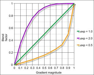 When the unnormalizedGradientExponent field (SoVolumeRenderingQuality) is greater than 0, the contribution of diffuse and specular lighting is reduced for voxels with small gradients. In other words ambient color will be the biggest contributor to the color of these voxels. The higher this value is, the more smaller gradients will contribute to lighting. Like surfaceScalarExponent, the reduction factor is computed from the gradient magnitude using an inverse power function where unnormalizedGradientExponent is the exponent value. Unlike surfaceScalarExponent, which affects all lighting factors, this field only affects the diffuse and specular values. Values higher than 256 will apply lighting on almost all surfaces. For most datasets, values between 2 and 16 should be enough. The default is 0.