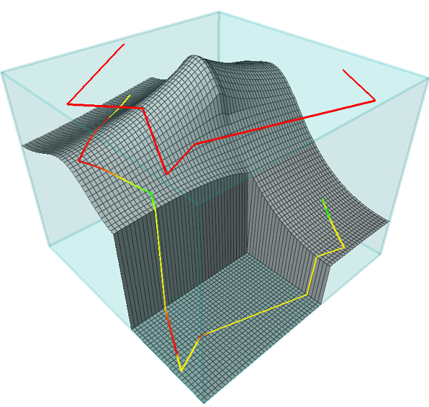 - The following images come from this example, and show a 3D red polyline on the top of the transparent cube that is projected and extracted onto the 3D surface mesh. The properties used to color the cells of the surface mesh are also extracted and displayed onto the projected polyline.