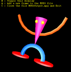 This example shows how to use the SoMPEGFrameRenderer and how to defien its parameters in order to save the rendered scene as a MPEG video file. In this example, frames are addeed to the resulting video by user, and frame by frame.
