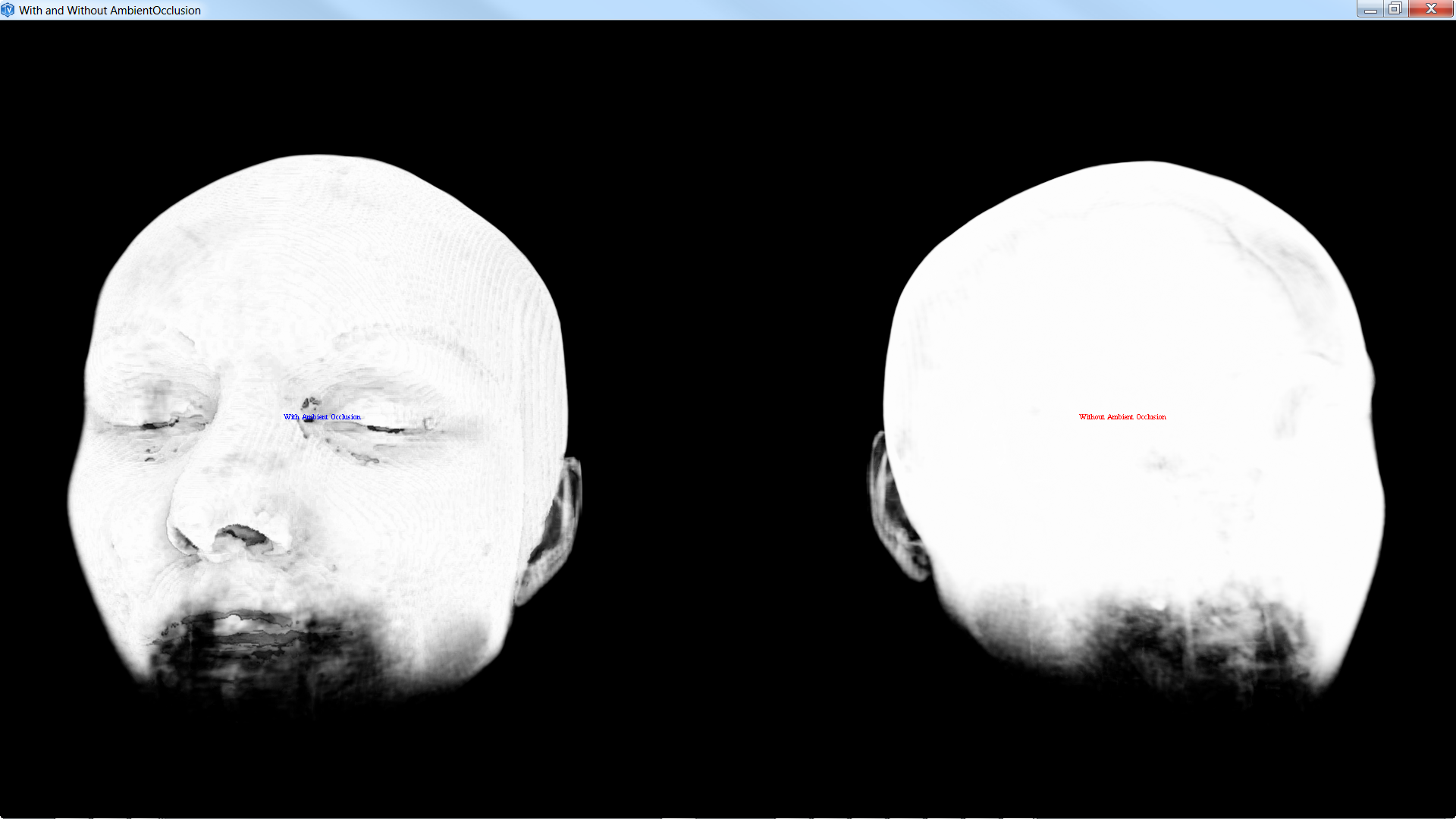 The rendering on the left is the one based on ambient Occlusion. The right one is the default rendering. The scene graph is defined in the $OIVHOME/examples/source/Medical/Rendering/Techniques/ambientOcclusion/medicalAmbientOcclusion.iv file. Set ambientOcclusion field from SoVolumeRenderingQuality to TRUE to activate ambient occlusion.