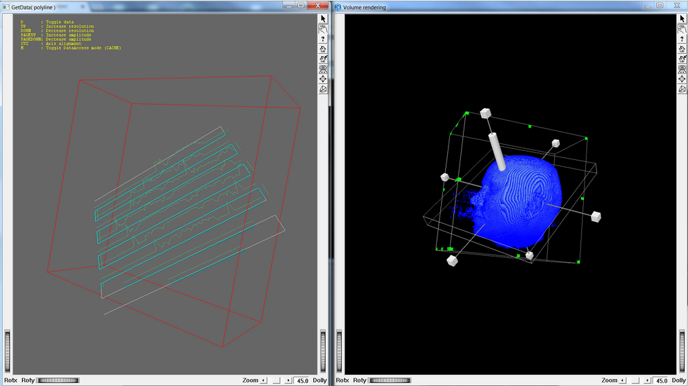 This program displays several segments build from data extracted out of the given volume. To update the second viewer, move the dragger plane in the main viewer. Lines are automatically updated in the second viewer. Changing data access mode (Direct, Direct and prefecth, Cache) will change the amount of memory allowed to LDM. As a result, the main volume will show a different resolution. This program demonstrates that even with low memory settings, data access can reach full resolution in Direct and Direct and prefetch mode.