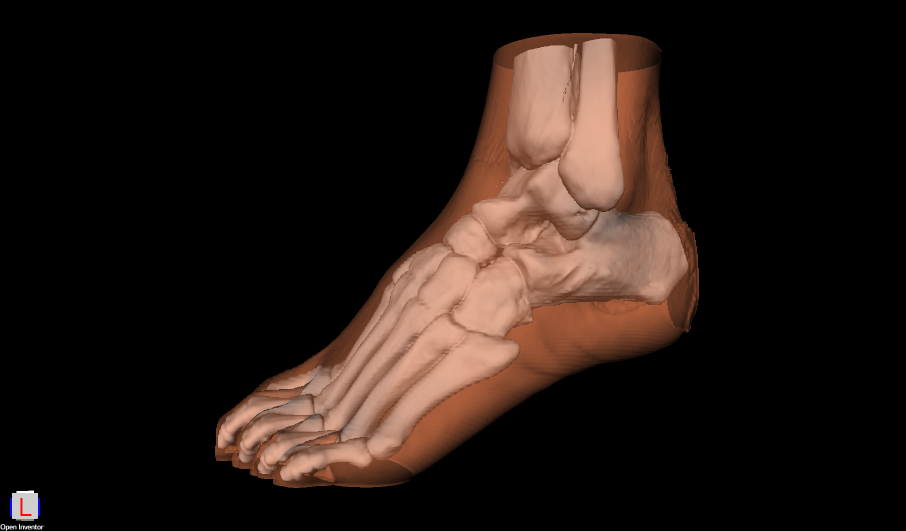 A SoMaterial node specifies the color and transparency of each isosurface. Here, for example, opaque bones and transparent skin.