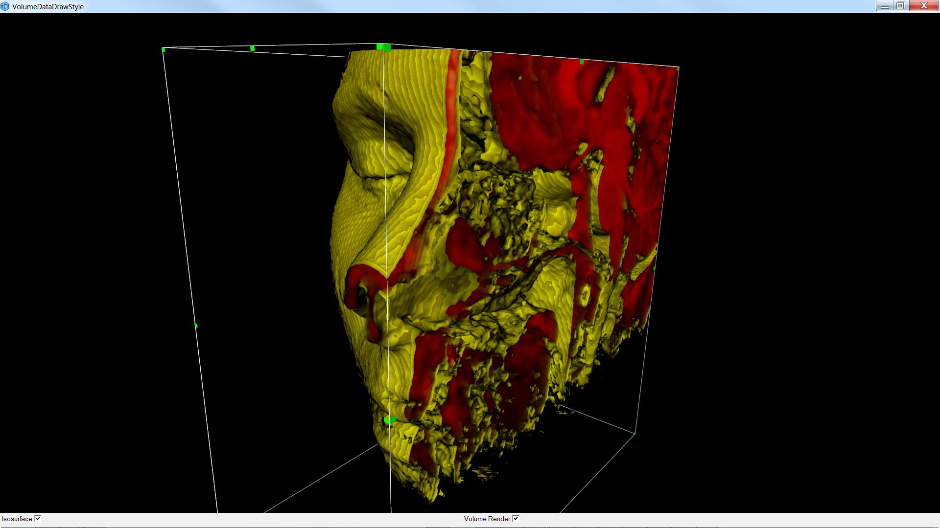Volume rendering is dark red and isosurface is yellow. User can toggle visibility of each style.