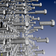 MultiInstancingBufferedShapes displays a scene containing a set of NumXxNumYxNumZ SoBufferedShape representing a CAD standard part containing about 34000 triangles and loaded from an external .iv file: screw_buffered_shape.iv. A GUI is set up with three sliders connected to the number of instances created along the X, the Y and Z world axes. The instances are disposed with a regular geometrical pattern in space, inside a cube, with scale factors applied and rotations applied in a cycle.