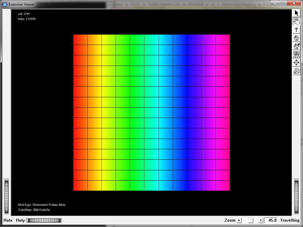 Click on the arrow icon to enable the picking. Move the mouse cursor over the mesh skin. The cell id of the pointed cell is displayed, as well as the interpolated scalar value at the pointed location, the mesh type and the scalar set name used for coloring.