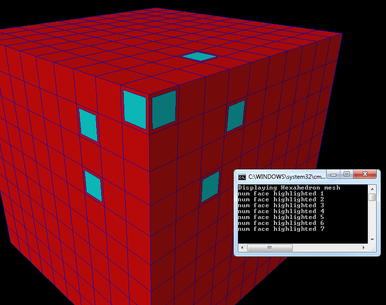 Move the mouse cursor over the mesh skin and click the left mouse button. Picked faces are drawn in cyan. Number of picked faces is displayed in the console window.