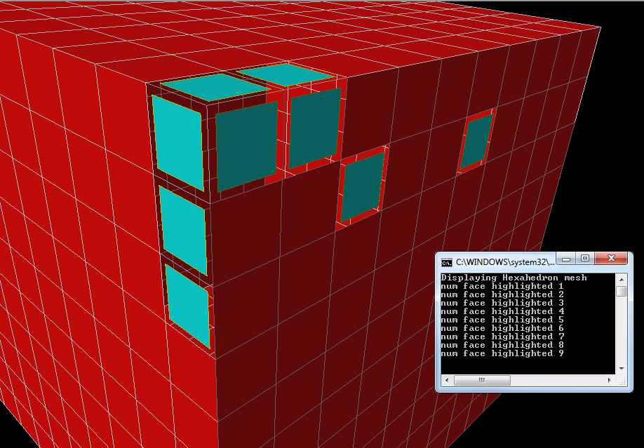 Move the mouse cursor over the mesh skin and click the left mouse button. Picked cells are drawn in cyan. Number of picked faces is displayed in the console window.