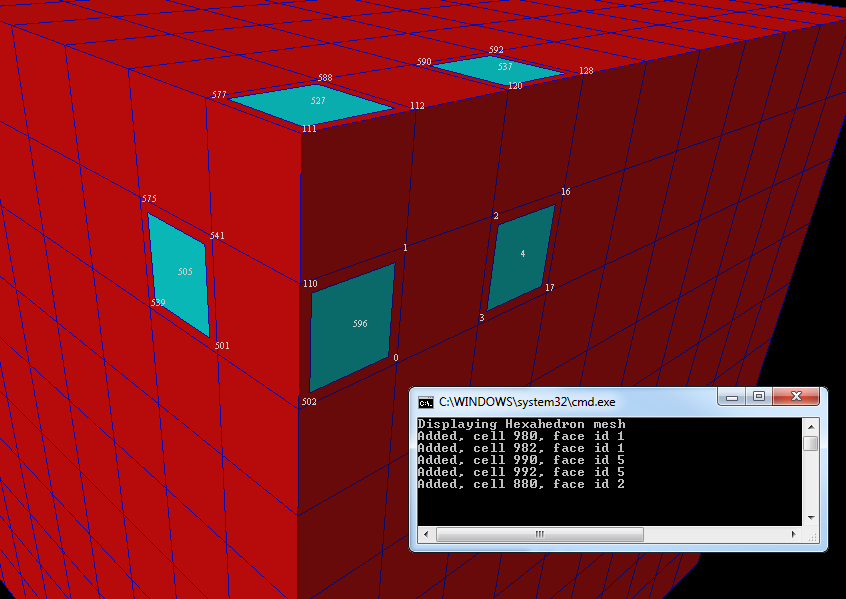 Move the mouse cursor over the mesh skin and click the left mouse button. Picked faces are drawn in cyan. Node ids of the picked faces are displayed in white.