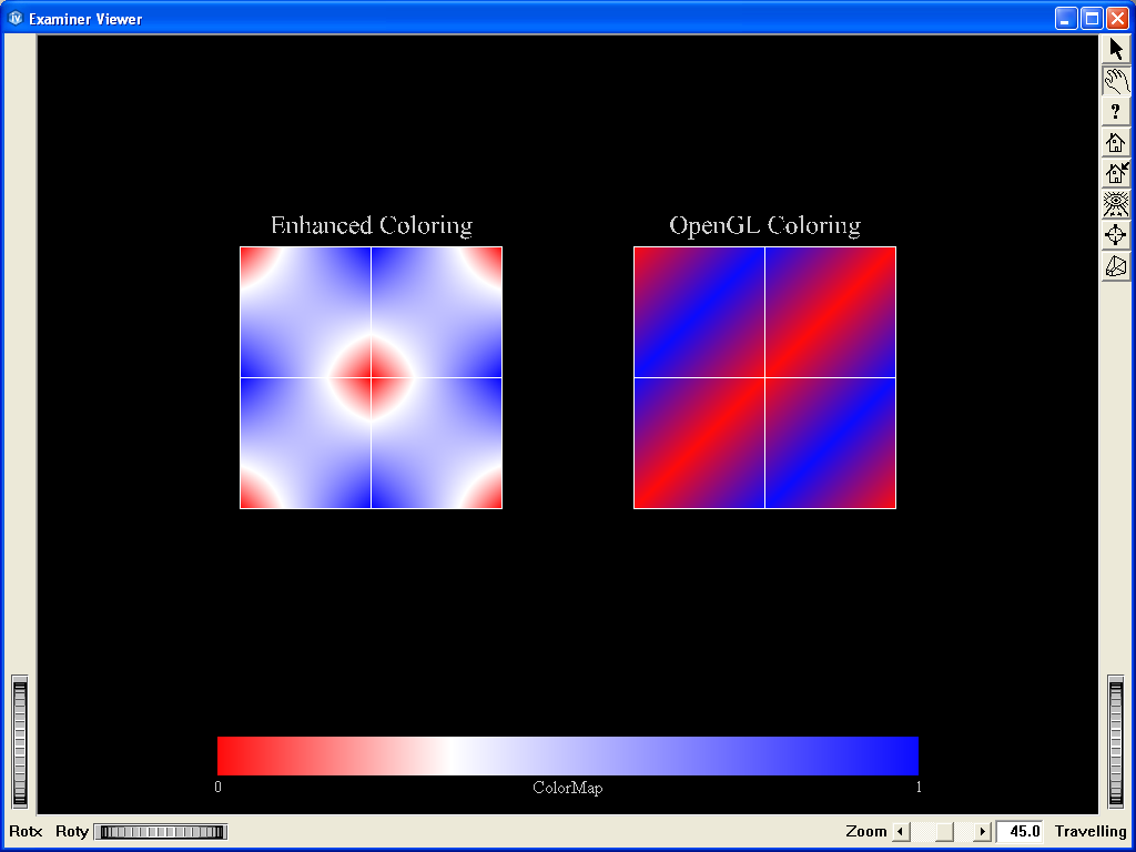 When the enhanced coloring method is enabled (enhancedColoring field set to TRUE), polygons are colored using a technique allowing to display more accurately the color gradient than what can be achieved normally with OpenGL.