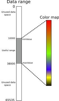 When minValue and maxValue are equal to 0 (the default), the entire range of the data type is mapped onto the color map, except in the case of float data. For example, for a color map of size N: